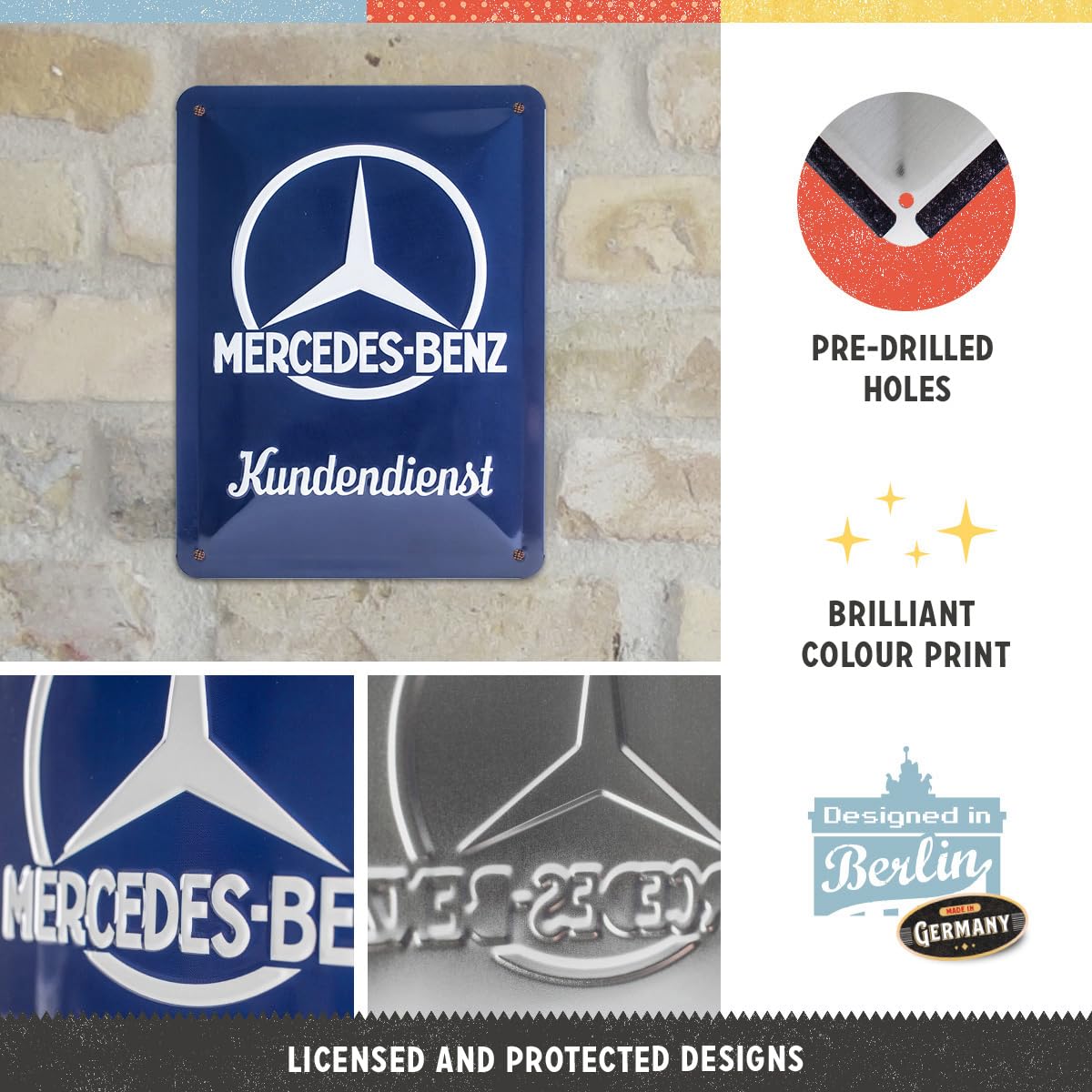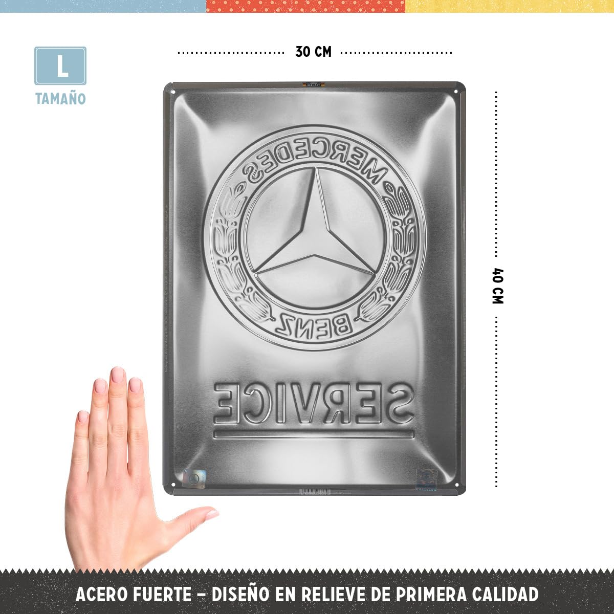 Está fabricado en Alemania con un acabado de alta calidad: impresión a color directa sobre el metal, barnizado para proteger los colores y un diseño en relieve que le da un toque tridimensional.