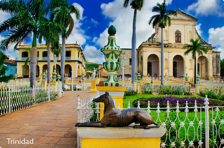 Desayuno y almuerzo. Caminata panorámica por el centro histórico, Patrimonio Mundial. Destacan: la Plaza Mayor, corazón de la ciudad; la Iglesia de San Francisco, sede del Museo Lucha Contra Bandidos; el Palacio Brunet, la Iglesia Parroquial, con un interesante altar; la Casa de los Conspiradores, ahora una galería; la Taberna Canchánchara, con el famoso cóctel de la casa que le hará reír; la calle del artista, llena de galerías. Almuerzo en el Restaurante La Botija o similar. En la noche: visitar el palenque Los Congos Reales, con música afrocubana en vivo; la Casa Fisher, con conciertos de salsa; la Casa de la Trova, abarrotada de ritmos originales.