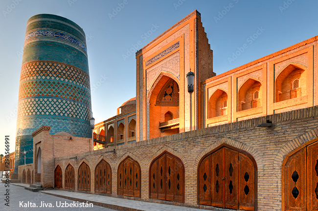 Desayuno y almuerzo. Continúa city tour de Tashkent con el antiguo Bazar Chorsu; el complejo arquitectónico Khasti Imam, centro religioso por siglos. Traslado al aeropuerto, vuelo a Urgench, traslado 1h a Jiva o Khiva, entre las ciudades más añoradas por las caravanas de la Gran Ruta de la Seda por ubicarse justo en el medio de dos duros desiertos: Kara-Kum y Kizil-Kum. City tour a Ichan Kala, el corazón fortificado de la ciudad de Jiva con 2 km de gruesas murallas. Su interior recuerda los mágicos relatos de los cuentos de Aladino. Destacan los dibujos en azulejos de Kalta Minar, un minarete inacabado cuyo impulsor Khan pretendía que fuera el octubrer del mundo; el Alcázar Kunya Ark, una ciudad fortificada dentro de otra donde vivían los gobernantes. Hotel Farovon 4**** o similar.