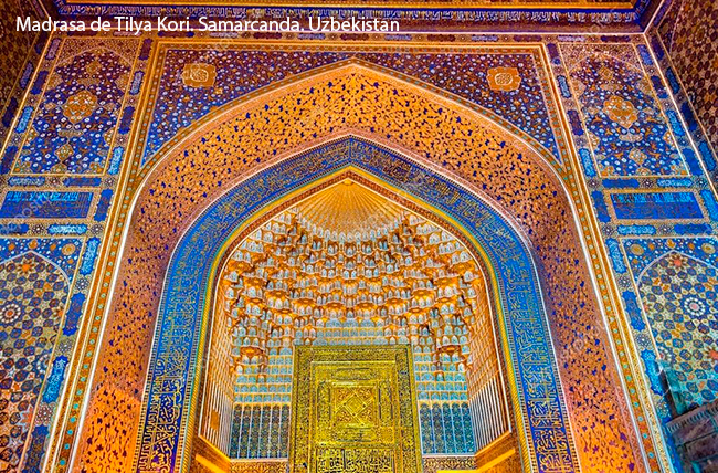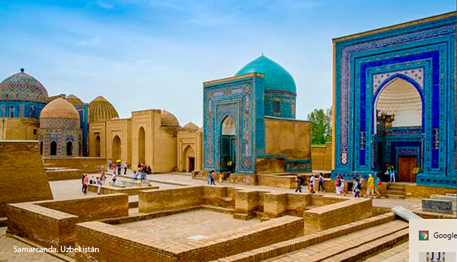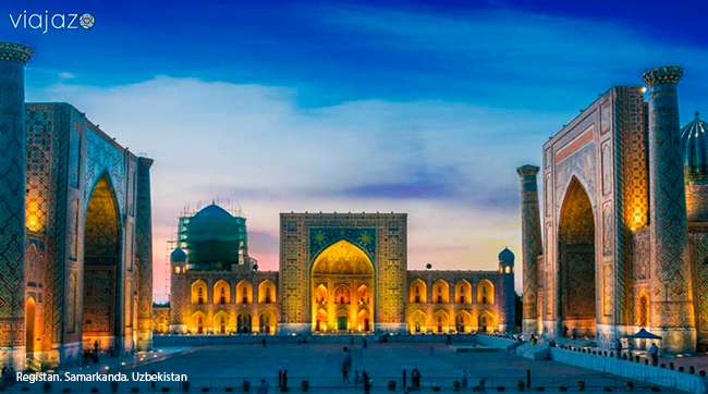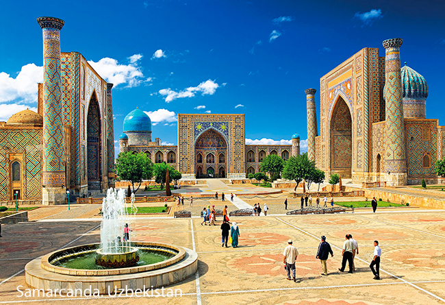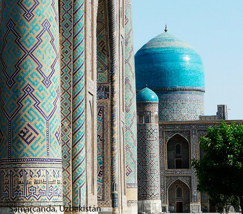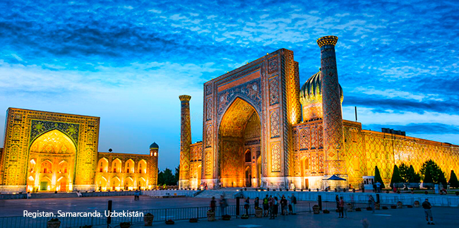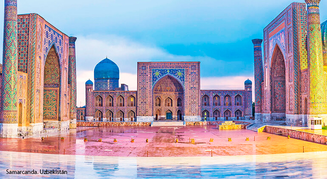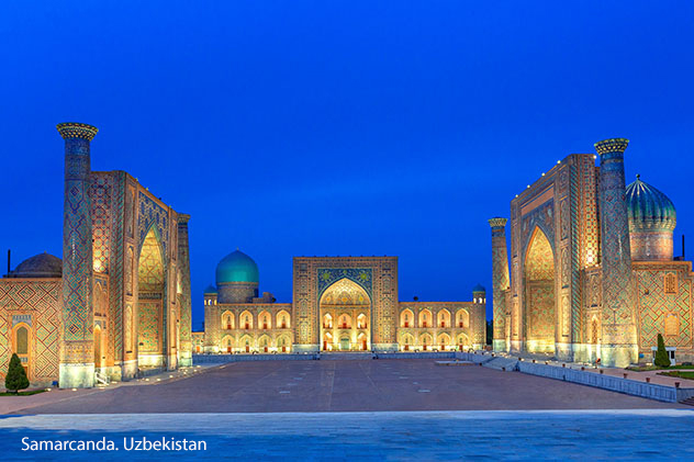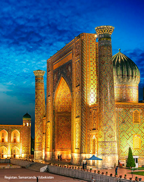Desayuno y almuerzo. Tour todo el día de Samarkanda. Destacan: la magnífica plaza Registan, centro neurálgico de Uzbekistán, el mundo islámico y la Ruta de la Seda. Con las enormes madrasas Ulughbek, Shir-Dor y Tilla-Kori; todas exquisitamente decoradas, con patios interiores ajardinados y espectaculares mezquitas de tonos azules y cúpulas doradas. Los mausoleos de Guri Emir, tumba real de los Timúridas, una obra magistral de la arquitectura de Asia Central decorada en jade de Timur, y el de Rukhabad (vista externa). Libre para disfrutar Samarcanda.