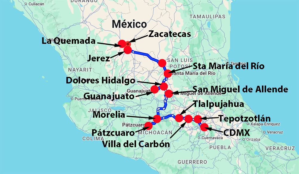 Sitios: Tepotzotlán, Villa del Carbón, Tlalpujahua, Morelia, Pátzcuaro, San Miguel de Allende, Dolores Hidalgo, Guanajuato, Santa María del Río, San Luis Potosí, Zacatecas, La Quemada, Jerez de García.